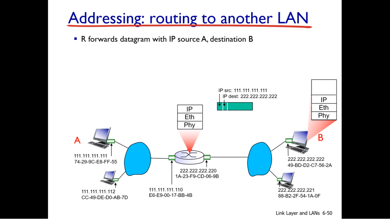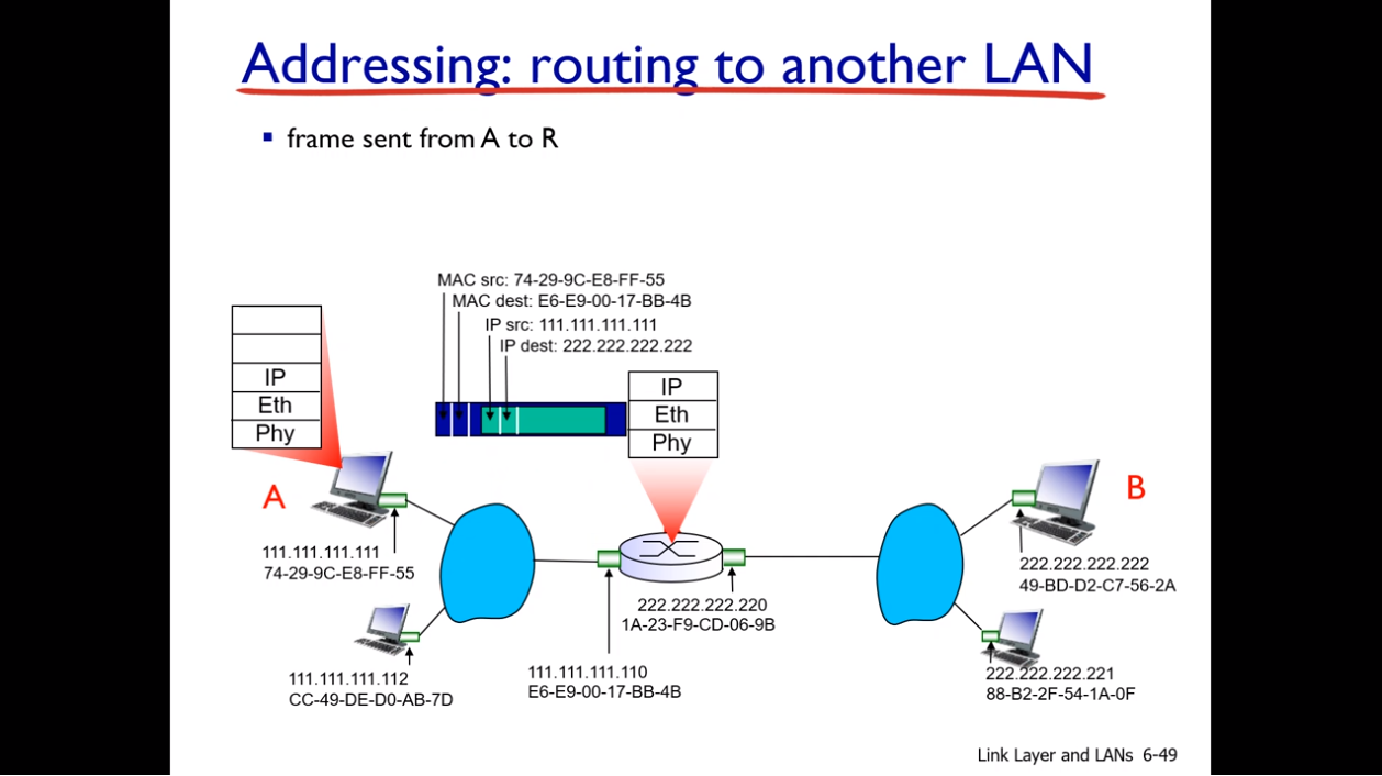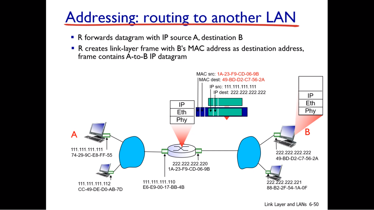 - 링크레이어에서 캡슐화 : A와 라우터 까지 소스 ,목적 MAC 주소 설정